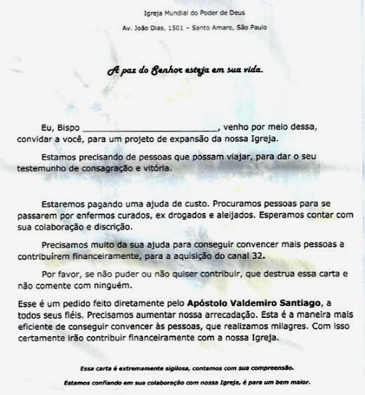 A carta diz que se trata de um pedido “feito diretamente pelo apóstolo Valdemiro Santiago” (foto) e que haverá uma “ajuda de custo” no caso de viagem. Acrescenta que quem não puder colaborar deve destruir o impresso, sem falar dele para ninguém.