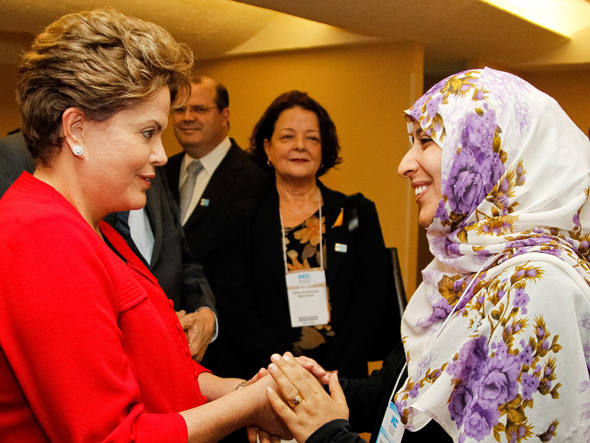 A ativista iemenita Tawakkol Karman, prêmio Nobel da Paz em 2011, foi recebida nesta quarta-feira pela presidente Dilma Rousseff e se interessou pelos programas brasileiros de combate à fome.