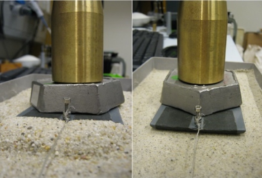 Os físicos colocaram, em uma bandeja de areia, uma versão de laboratório do trenó egípcio. Eles determinaram tanto a força de tração necessária e a rigidez da areia como uma função da quantidade de água na areia. Para determinar a rigidez, eles usaram um reômetro, que mostra quanta força é necessária para deformar um certo volume de areia.