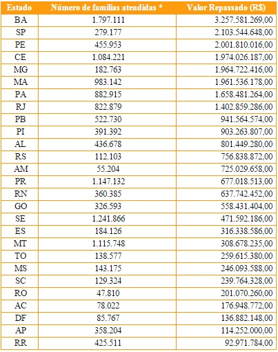 Mas enganam-se aqueles que imaginam que os programas sociais contemplam apenas o Nordeste brasileiro. A tabela 1 indica, claramente, que esse programa não beneficia apenas essa região, bastando para isso observar a posição de São Paulo, Minas Gerais e Rio de Janeiro, estados que receberam, aproximadamente, 22% do total de recursos totais do Bolsa Família. Todos os municípios brasileiros foram contemplados, o que torna o Bolsa Família o programa de maior capilaridade social e econômica do país.