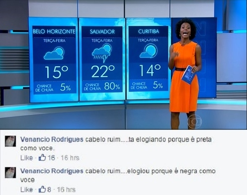 A despeito dos elogios, internautas atacaram a jornalista por ela ser negra. Ao ser congratulada por uma outra internauta negra, um usuário do Facebook com o nome de Venancio Rodrigues retrucou: “Cabelo ruim. Tá elogiando porque é preta como você”, e repetiu a frase em seguida, substituindo a palavra ‘preta’ por ‘negra’. O mais chocante é que os comentários receberam, respectivamente, dezesseis e oito curtidas (imagem acima).