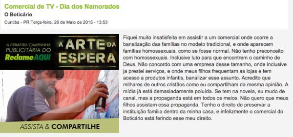 No mesmo dia em que Malafaia divulgou o vídeo de boicote ao Boticário, foi confirmado pelo Conselho Nacionalde Autorregulamentação Publicitária (Conar) que cerca de 20 consumidores entraram com queixas contra a empresa de cosméticos e o comercial com casais gays.