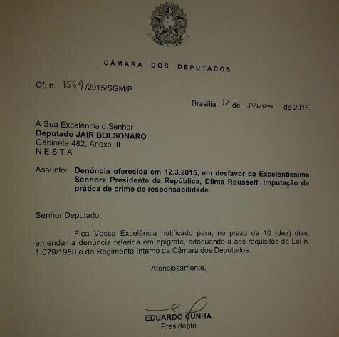 “Fica Vossa Excelência notificado para, no prazo de 10 (dez) dias, emendar a denúncia referida em epígrafe, adequando-a aos requisitos da Lei n. 1079/1950 e do Regimento Interno da Câmara dos Deputados”, notifica Cunha, no ofício encaminhado a Bolsonaro e aos demais cidadãos, obviamente alterado o pronome de tratamento para os outros 11 subscritores.