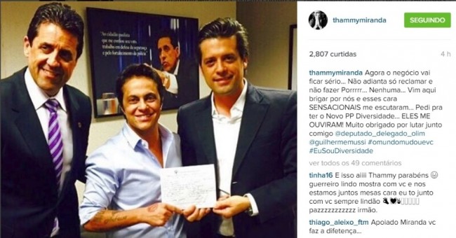 Thammy Miranda se filiou ao Partido Progressista, em São Paulo, nesta quarta-feira. Ao lado dos deputados Antonio Olim e Guilherme Mussi, o ator transexual anunciou a filiação com uma foto postada nas redes sociais. Ele chega ao PP para presidir o núcleo de diversidade. “Agora o negócio vai ficar sério. Não adianta só reclamar e não fazer po…nenhuma. Vim aqui brigar por nós e esses caras sensacionais me escutaram. Pedi para ter o novo PP Diversidade, e eles me ouviram. Muito obrigado por lutar junto comigo”, escreveu na legenda da imagem.