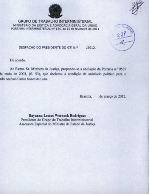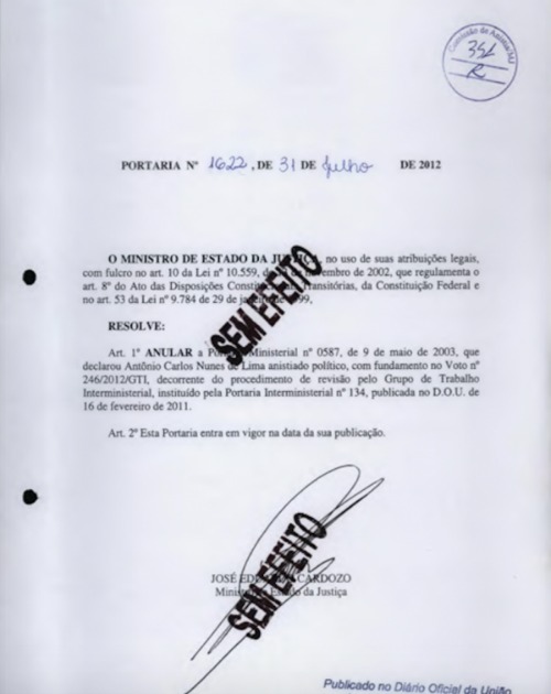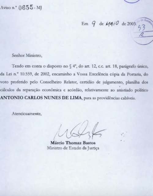 Em 9/5/2003, o então ministro da Justiça Márcio Thomaz Bastos assina a concessão de anistia para Antônio Carlos Nunes de Lima.