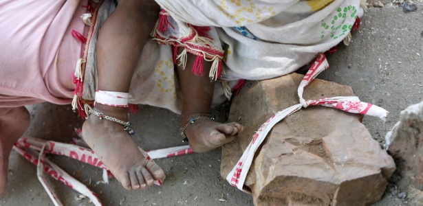 Sua mãe, Sarta Kalara, diz que não tem outra opção além de amarrar a pequena Shivani à pedra enquanto seu marido e ela trabalham para ganhar 250 rúpias (cerca de US$ 3,8, o equivalente a R$ 13,50) cavando buracos para cabos de eletricidade na cidade de Ahmedabad, na Índia.