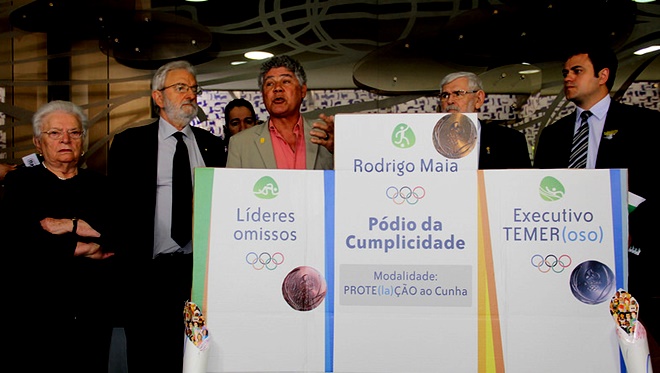 Deputados do Psol apresentaram na manhã de quarta-feira (3) o “Pódio da Cumplicidade”, na modalidade “prote(la)ção” ao ex-presidente da Câmara Eduardo Cunha (PMDB-RJ). Os “medalhistas” da categoria são o presidente da Câmara, Rodrigo Maia (DEM-RJ), o presidente interino Michel Temer e “líderes omissos”. Segundo o líder do partido, Ivan Valente (SP), ”há uma cumplicidade, um conluio, uma disputa para saber quem protege mais Eduardo Cunha”.