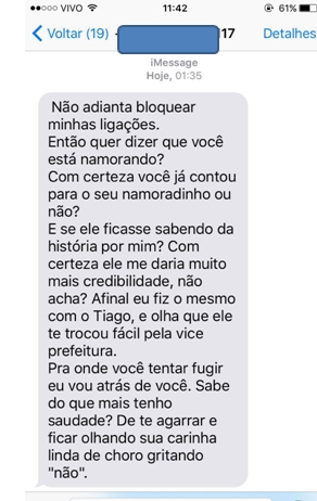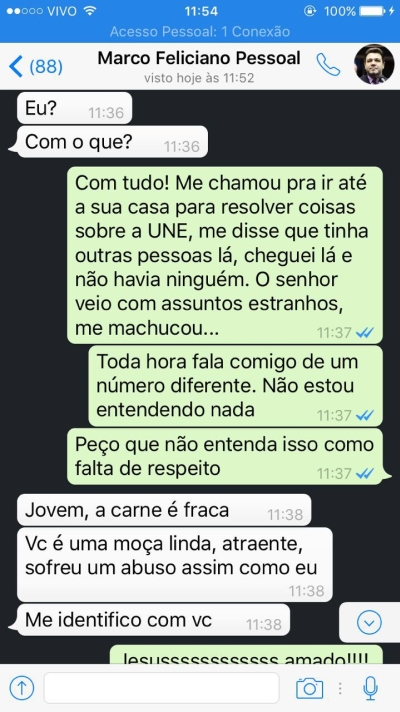 A vítima possui transcrições e prints das conversas que manteve com o deputado pelo Whatsapp. Segundo a jovem, em um encontro há semanas, ele pegou o celular à força e apagou todas as mensagens entre eles, mas a estudante conseguiu resgatá-las no ICloud de seu computador.