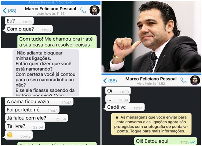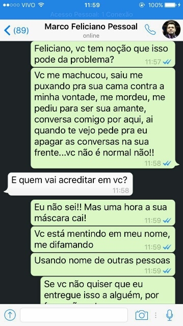 Jovem de 22 anos acusa Marco Feliciano de agressão grave e tentativa de estupro. Militante do PSC revela que foi agarrada no apartamento do pastor e agredida fisicamente após rejeitar suas investidas. A garota foi ameaçada e precisou 'desaparecer' depois de externar que denunciaria o caso. Conversas de WhatsApp foram divulgadas
