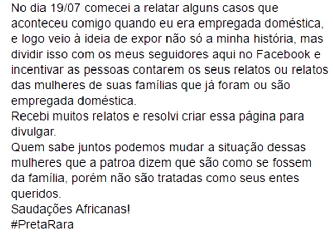 Foi o que fez a rapper e professora Preta-Rara, ex-doméstica, ao divulgar com muita habilidade, por meio do Facebook, os relatos de várias domésticas, ex-domésticas, filhos de domésticas. Tudo sob o guarda-chuva da hashtag #EuEmpregadaDoméstica, que também já repercutiu no Twitter.