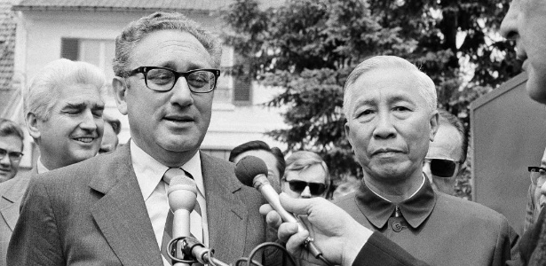 1973: Henry A. Kissinger e Le Duc Tho — Em foto de 1973, os ganhadores do prêmio Nobel da Paz: Henry A. Kissinger (esq), secretário de Estado dos EUA, e Le Duc Tho, líder do Vietnã do Norte. Os dois homens facilitaram o acordo de cessar-fogo na Guerra do Vietnã. Críticos apontaram, no entanto, que bombardeios por parte dos EUA continuavam no Camboja no ano em que o prêmio foi entregue, além de acusarem Kissinger, entre outras coisas, de crimes de guerra pelo fornecimento de armas e apoio a ditadores sul-americanos na Operação Condor, que matou milhares de pessoas como repressão ao comunismo no Brasil, na Argentina, na Bolívia, no Chile, no Paraguai e no Uruguai. Le Duc Tho se recusou a receber o prêmio, afirmando que a paz ainda não havia sido restaurada na parte sul do Vietnã.