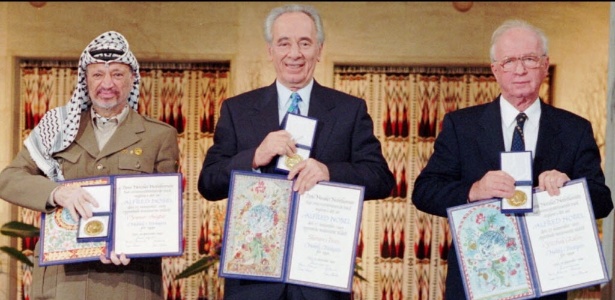 1994: Iasser Arafat, Shimon Peres e Yitzhak Rabin — Em foto de 1994, da esquerda para a direita: Iasser Arafat (líder palestino), Shimon Peres (chanceler israelense) e Yitzhak Rabin (premiê de Israel) seguram suas medalhas e certificados conferindo aos três o prêmio Nobel da Paz. O trio foi premiado “por seus esforços para criar a paz no Oriente Médio”. Mais de duas décadas depois, ainda está longe de chegar ao fim o impasse entre palestinos e israelenses sobre a criação de dois Estados. O premiê israelense, Benjamin Netanyahu, e o o presidente da Autoridade Nacional Palestina (ANP), Mahmoud Abbas, alternam momentos de aproximação e distanciamento, e nenhum líder dos dois países conseguiu consolidar de fato os Acordos de Oslo – acertados entre Arafat, Peres e Rabin em 1993 e 1995 e que motivaram a entrega do Nobel ao trio.
