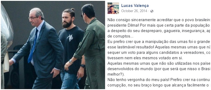 Transformado em celebridade após escoltar Eduardo Cunha, "Hipster da Federal" atribuiu vitória de Dilma a manipulação das urnas eletrônicas. Lucas Valença já pedia o impeachment da presidente eleita antes mesmo das eleições de 2014