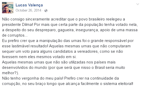 Indignado com a vitória da presidente eleita em 2014, o agente da Polícia Federal atribuiu a vitória de Dilma Rousseff à manipulação das urnas eletrônicas.