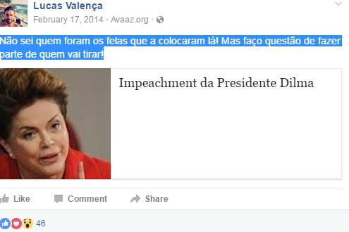 Antes mesmo da vitória de Dilma, em fevereiro de 2014, ele havia compartilhado uma petição do site Avaaz pela saída da petista. “Não sei quem foram os felas que a colocaram lá! Mas faço questão de fazer parte de quem vai tirar!”, postou na ocasião.