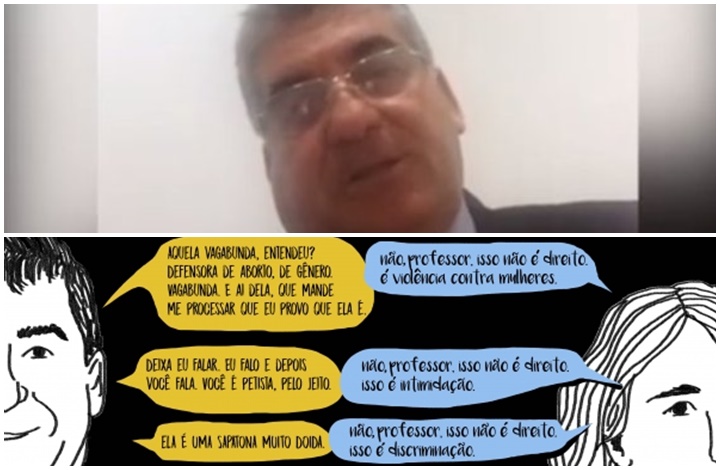 Questionado por aluna em sala de aula, professor universitário ataca advogada e pesquisadora da UnB que foi aplaudida após palestra que tratava de aborto e de questões de gênero no campo do Direito. "Ela é uma sapatona muito doida. Uma bostinha. Ela veio com uma ideologia petista; eu odeio o PT"