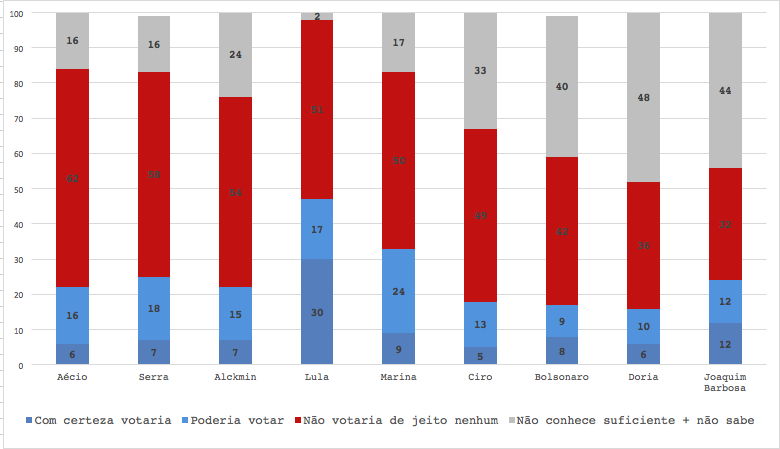 Jair Bolsonaro, que tenta se beneficiar da onda de rejeição a políticos – apesar de ser deputado desde o começo dos anos 90 –, aparece com 17% de potencial de voto na pesquisa. Seu possível contingente de eleitores cresceu seis pontos porcentuais desde o ano passado, mas a parcela que o rejeita aumentou ainda mais, de 34% para 42%.