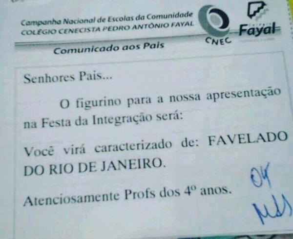 A escola particular Cenecista Pedro Antônio Fayal, de Itajaí (SC), encaminhou para os pais de alunos do 4º ano um comunicado que pede que as crianças compareçam a uma festa fantasiados de “favelados do Rio de Janeiro”.