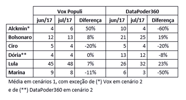 Pelo Vox Populi, entre junho e julho desse ano — respectivamente antes e depois da condenação – Lula cresce 7% (de 45 para 48%), Bolsonaro cresce 8% (de 12 para 13%). Dória fica estagnado, Alckmin chega aos 6%, e Marina e Ciro caem um pouco.