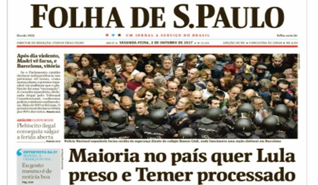 A edição da Folha de São Paulo da segunda-feira – 02 de outubro de 2017 – parecia ter sido planejada para criar um anticlímax nas hostes petista. Logo após a edição do domingo anterior, quando noticiou que Lula ganharia as eleições de 2018 qualquer que fosse seu adversário – inclusive o juiz Sergio Moro, o jornal trazia a manchete: “maioria no país quer Lula preso”.