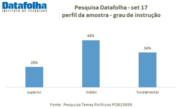 O que não significa, de modo algum, que a pesquisa Datafolha contenha qualquer tipo de manipulação ou incorreção dos dados, deixemos claro. Como tem apenas três estratos – fundamental, médio e superior, a diferença com os dos do IBGE pode ter surgido da forma como o Datafolha alocou as respostas relativas a médio e superior incompletos.