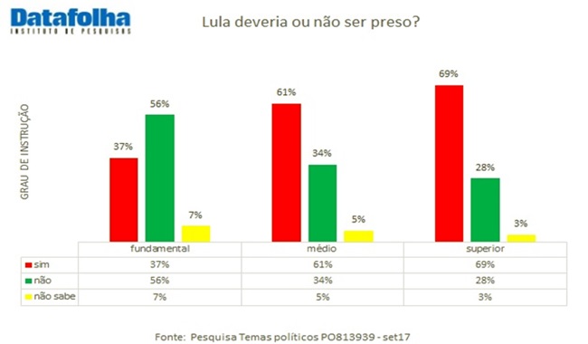 69% dos que têm instrução superior e 61% dos que têm nível médio querem Lula preso. O índice cai para 37% entre dos de instrução fundamental.