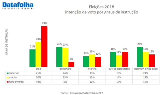 A amostragem do Datafolha privilegiaria a opinião dos estratos mais educados da população, em detrimento dos de menor grau de instrução. Daí o Lula preso estar em maioria.