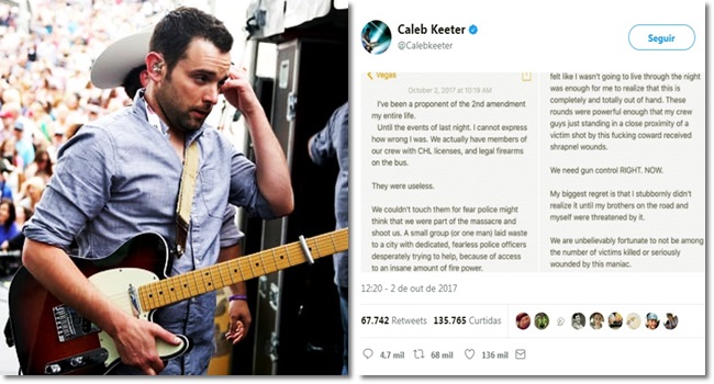 Um dos depoimentos mais tocantes sobre o assunto foi publicado ontem (2) pelo guitarrista Caleb Keeter, da banda country Josh Abbott. Keeter se apresentou no Route 91 Harvest Festival e disse que o massacre mudou sua visão sobre o controle de armas no país.