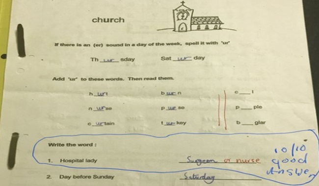 A questão da lição de casa pedia que Yasmin escrevesse uma palavra para representar “senhora que trabalha em um hospital“. O pai dela compartilhou sua resposta no Twitter.