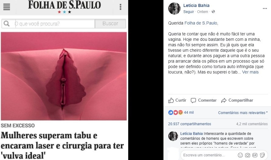 “Mulheres superam tabu e encaram laser e cirurgia para ter a ‘vulva ideal'”, dizia o título do texto. Dentro da reportagem, opiniões opostas dos médicos estão lado a lado.