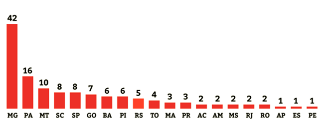 Minas Gerais é o estado que lidera o cadastro: dos 131 empregadores listados, quase um terço é mineiro. De acordo com a coordenadora do projeto de combate ao trabalho análogo ao escravo de Minas, Dolores Jardim, “não significa que Minas tenha mais trabalhadores [em situação de trabalho escravo] que outros estados, mas que estamos atendendo a demanda [de fiscalização] por uma questão de gestão”. São 19 gerências no estado, todas com auditores treinados pelo projeto.