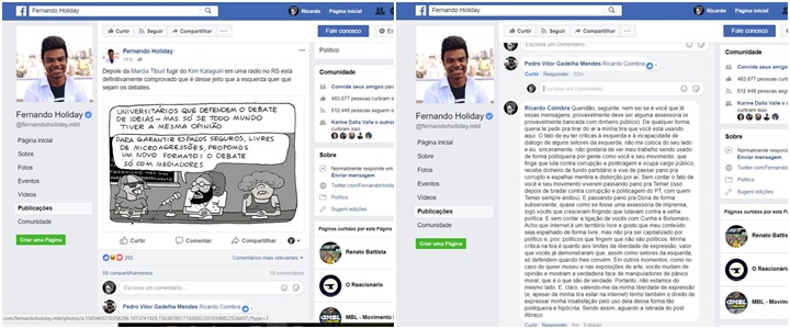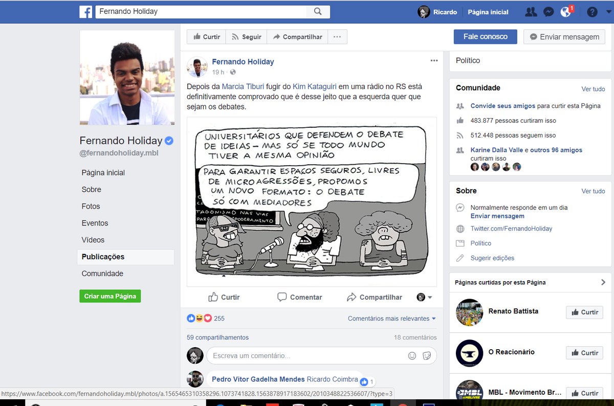 O vereador Fernando Holiday (DEM-SP), do Movimento Brasil Livre (MBL), foi obrigado a tirar do ar um quadrinho que havia divulgado para criticar a professora Márcia Tiburi por ela ter se recusado a dividir bancada com Kim Kataguiri em um programa de rádio.