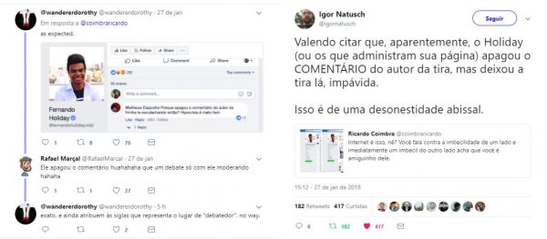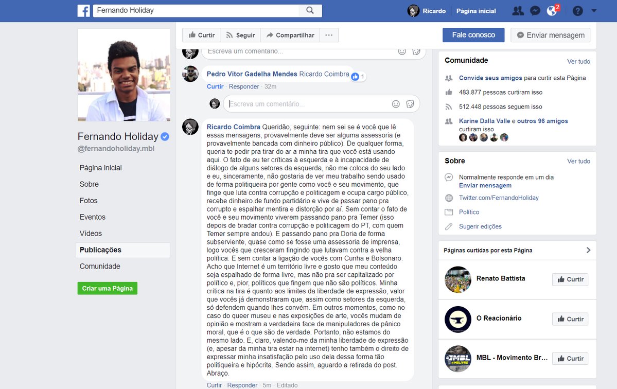 No entanto, ao invés de apagar a publicação, como solicitou Coimbra, Holiday demonstrou a dimensão de sua desonestidade e excluiu o comentário do desenhista. Tarde demais, a mensagem já havia sido printada. Veja abaixo.