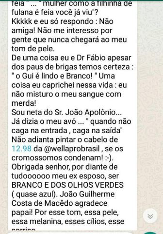 Na última denúncia envolvendo a bebê de 1 mês e a mãe da criança, Delzuíte usa frases como “Já vi que você saiu da senzala mas a senzala ainda não saiu de você” [sic]; “Minhas amigas me perguntam se já vi como a filhinha de fulana é feia, e eu só respondo: ‘não me interesso por gente que nunca chegará ao meu tom de pele’ […] não misturo o meu sangue com merda!”.