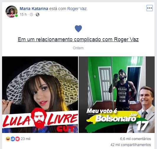 Maria Katarina é apoiadora de Lula e do PT. O namorado dela, Roger Vaz, declarou voto no conservador Jair Bolsonaro (PSL). Uma publicação feita por Maria viralizou nas redes sociais.
