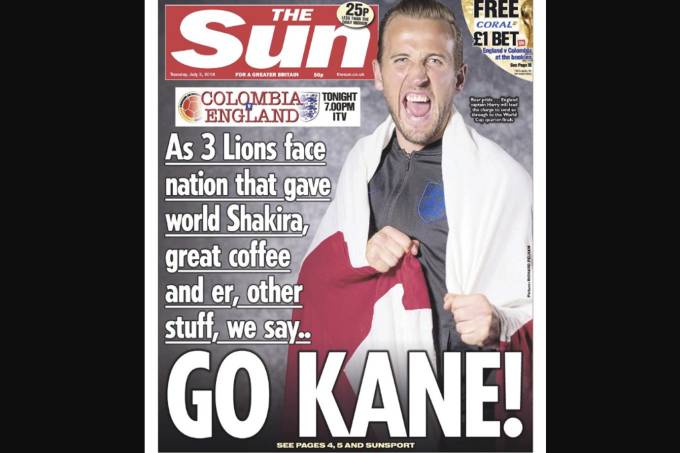 Conhecido por suas manchetes sensacionalistas, o tabloide britânico “The Sun” causou polêmica com uma capa que dizia: “Enquanto os 3 leões enfrentam a nação que nos deu Shakira, café e outras coisas, nós dizemos: GO KANE”.