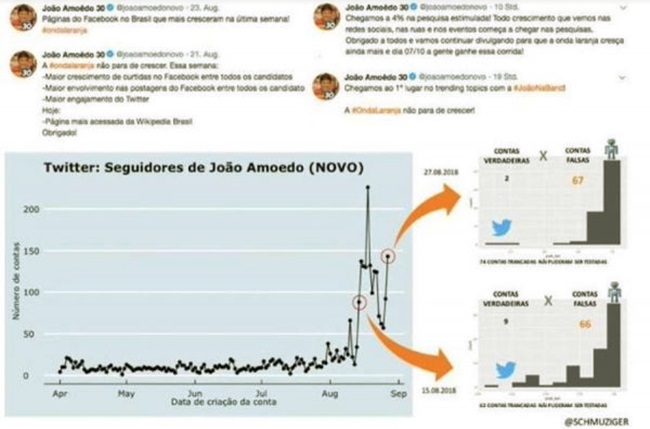 Analisou os dados dos últimos 40 mil novos seguidores de Amoêdo e verificou que os grandes picos de contas criadas foram a partir daquela data. Rafael desconfiava da existência de bots (robôs) e utilizou a ferramenta ‘botornot’ para testar as contas. O que encontrou foi que no dia 15, das 75 contas testadas, 66 eram bots. No dia 27, foram 67 contas falsas de um total de 69. Só duas contas eram verdadeiras.