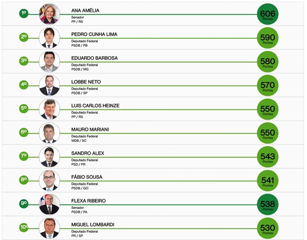 A deputada Luiza Erundina (PSOL), que não responde a nenhum processo, aparece em 505° lugar no ranking geral. O senador José Medeiros (Pode), que teve seu mandato cassado por fraude essa semana, aparece em 80° e é considerado o 3° melhor congressista do seu estado.