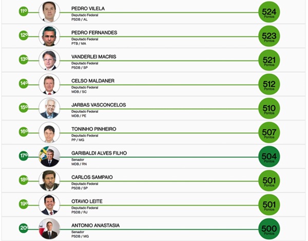 Há outros 13 conselheiros, todos com o mesmo perfil pró-mercado. São eles os responsáveis por definir a “qualidade legislativa”, que é disparado o critério mais importante para determinar o posicionamento dos parlamentares no ranking. A lista dos 20 melhores políticos eleitos do Brasil é hilária e não resiste a uma googlada.