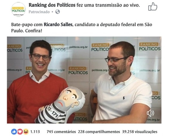 Diferente do site, a página do Facebook do Ranking dos Políticos escancara bem mais a ideologia que o norteia e coloca em xeque a sua declarada independência política-partidária. Além de ter um importante filiado do partido Novo entre seus conselheiros, o grupo tem feito uma série de entrevistas com candidatos, sendo que os últimos 3 entrevistados são do partido … Novo. Talvez seja apenas uma dessas coincidências do destino.