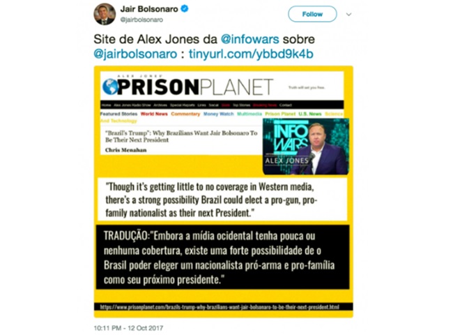 Uma “reportagem” em um de seus sites tinha o título “O Trump do Brasil: Por que os brasileiros querem que Bolsonaro seja seu próximo presidente”.