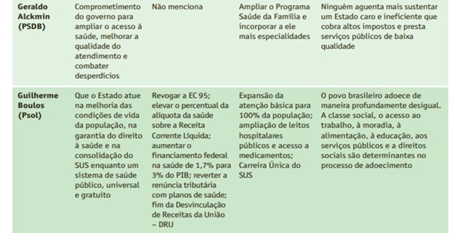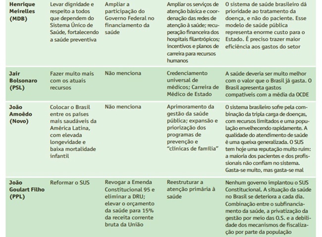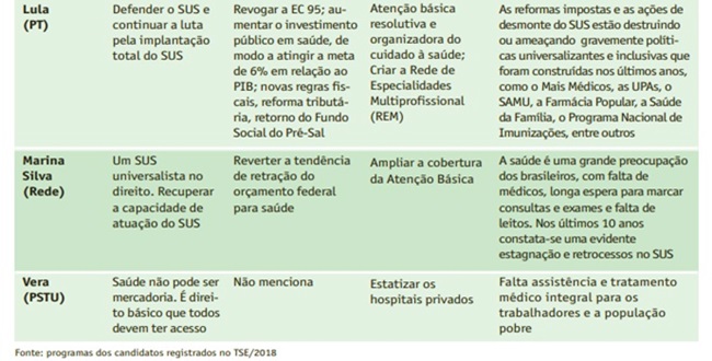 Bolsonaro, por exemplo, aponta para uma “atenção básica nacionalizada” e afirma a possibilidade de o governo credenciar médicos particulares. “E a falta de debates sobre políticas de saúde efetivamente universais e de qualidade permitem interpretações sombrias”. O fato de os candidatos não enfatizarem o SUS com um todo, os direitos assistenciais para todos os níveis de atenção, e de não explicitar como deverão obter recursos para viabilizar as promessas expressa compromissos limitados.