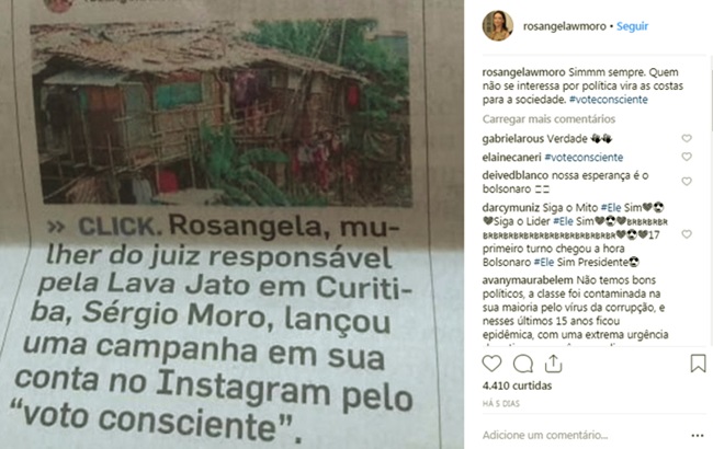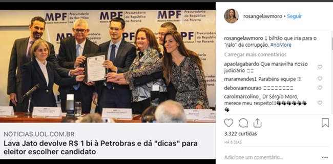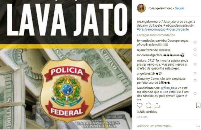 Rosângela, como qualquer cidadão, pode expressar livremente sua opinião, mas não dá para dissociar o que ela posta da atuação de seu marido, o juiz Sergio Moro, que lidera a Lava Jato.