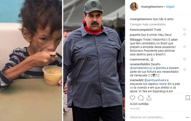 Postou também mensagem com uma foto de uma criança desnutrida, supostamente venezuelana, ao lado de Nicolás Maduro gordo e a frase: “Isso não está certo”.