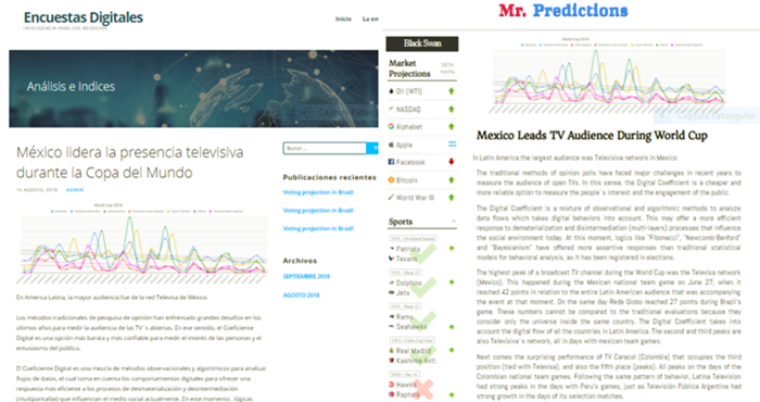 Além dessa, todas as outras publicações do Encuestas Digitales são traduções de pesquisas realizadas pela Mr. Predictions, exceto pelas quatro projeções de voto de eleições brasileiras que trazem Bolsonaro à frente com larga margem. É o caso da publicação sobre engajamento nas redes sociais dos candidatos brasileiros, dos exemplos de mapeamento de intenção de voto para as eleições paraguaias, do ranking digital dos times da libertadores. Os posts aparecem no site da Mr. Predictions com o texto idêntico, mas em inglês. O Encuestas Digitales traduziu para o espanhol as pesquisas.