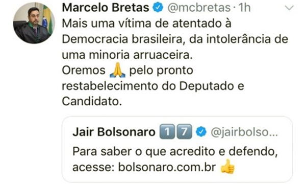 Folha anotou que juízes são proibidos de se manifestar sobre política de maneira eleitoral ou partidária. Mas, na segunda (17), Bretas compartilhou uma notícia sobre pesquisa eleitoral em que Bolsonaro aparecia na frente com os dizeres: “É chegada a hora da decisão. Participemos todos do processo eleitoral. Informe-se e escolha seus candidatos.”