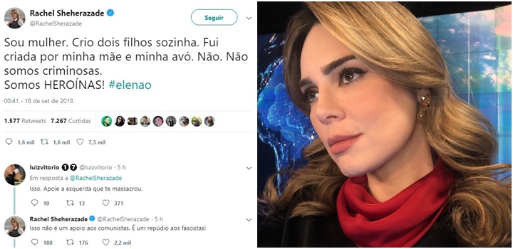 Conhecida representante da direita no jornalismo brasileiro, Rachel Sheherazade usou a hashtag #EleNão para repudiar publicamente Jair Bolsonaro e o seu vice, General Hamilton Mourão.