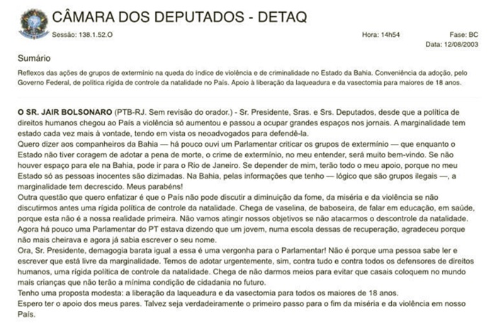 Em 12 de agosto de 2003, o deputado Jair Bolsonaro foi ao microfone do plenário da Câmara dos Deputados e fez veemente defesa dos crimes de extermínio. Exaltados como solução para a política de segurança a ser adotada no Rio de Janeiro. O motivo para a apaixonada defesa era a ação de um esquadrão da morte que vinha aterrorizando a Bahia desde o início daquela década. Deu boas vindas aos foras da lei mesmo reconhecendo a ilegalidade.