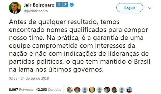 O presidenciável Jair Bolsonaro (PSL), declarou em sua conta no Twitter, que vai montar o seu “time” com uma “equipe comprometida com interesses da nação e não com indicações de lideranças de partidos políticos”.
