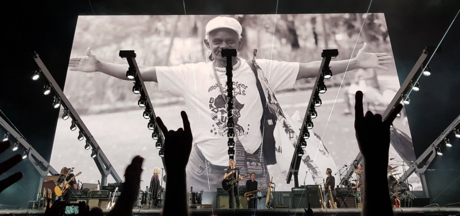 Um telão de 70 metros de largura integrado ao palco exibiu uma foto de Moa do Katendê de braços abertos. Em seguida, Roger Waters pediu paz e chorou no palco. O momento levou o público à loucura e a reação foi instantânea.